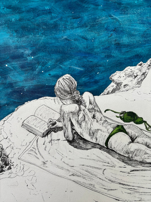 De geschilderde lagen zijn intuïtief, impulsief en emotioneel. Ze tonen chaos, energie en gevoel zonder filter. Daarover of daartussen teken ik met pen realistische figuren, gezichten of details — precies, kwetsbaar en menselijk. Het is een dialoog tussen emotie en bewustzijn, tussen het onderbewuste en het rationele.