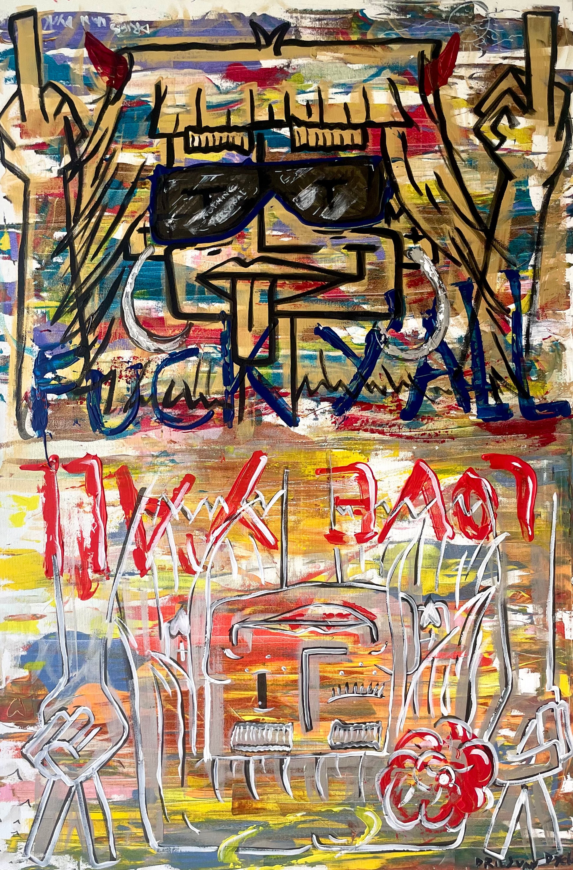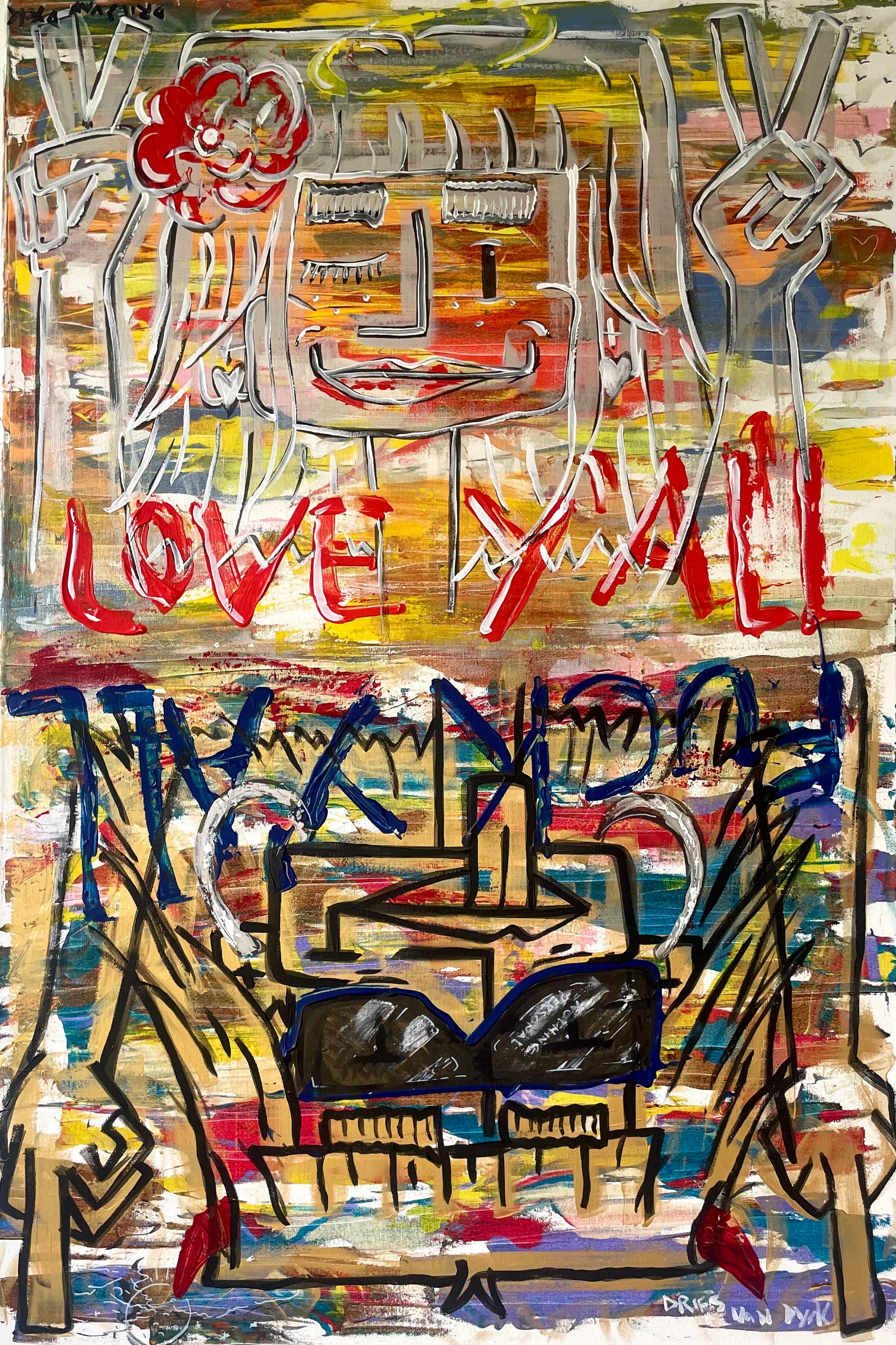 Aan de ene kant zie je een stoere vrouw die luid en duidelijk “Fuck y’all” zegt—perfect voor momenten waarop je grenzen wilt stellen of je innerlijke kracht wilt omarmen. Draai het schilderij om, en je ontmoet een lieve vrouw die zachtjes “Love y’all” zegt, als een uiting van warmte, liefde en verbinding.