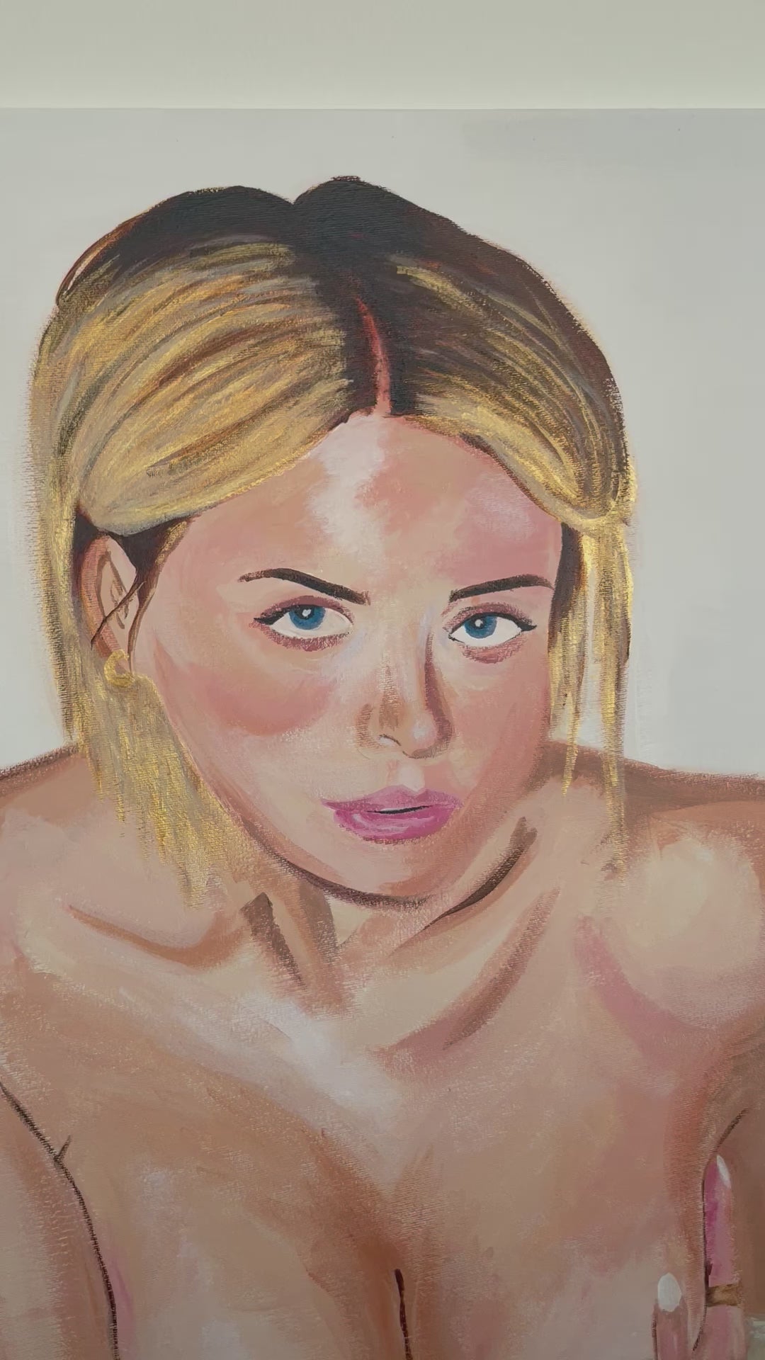 Dit schilderij toont een naakte dame in bad, haar borsten zichtbaar, maar haar ogen kijken recht in die van jou. Deze directe blik roept een gevoel van schuld op bij de toeschouwer, waardoor een intense emotionele reactie ontstaat. Het contrast tussen haar kwetsbaarheid en haar confronterende blik maakt dit kunstwerk bijzonder krachtig en uitnodigend tot diepere reflectie over voyeurisme en intimiteit.