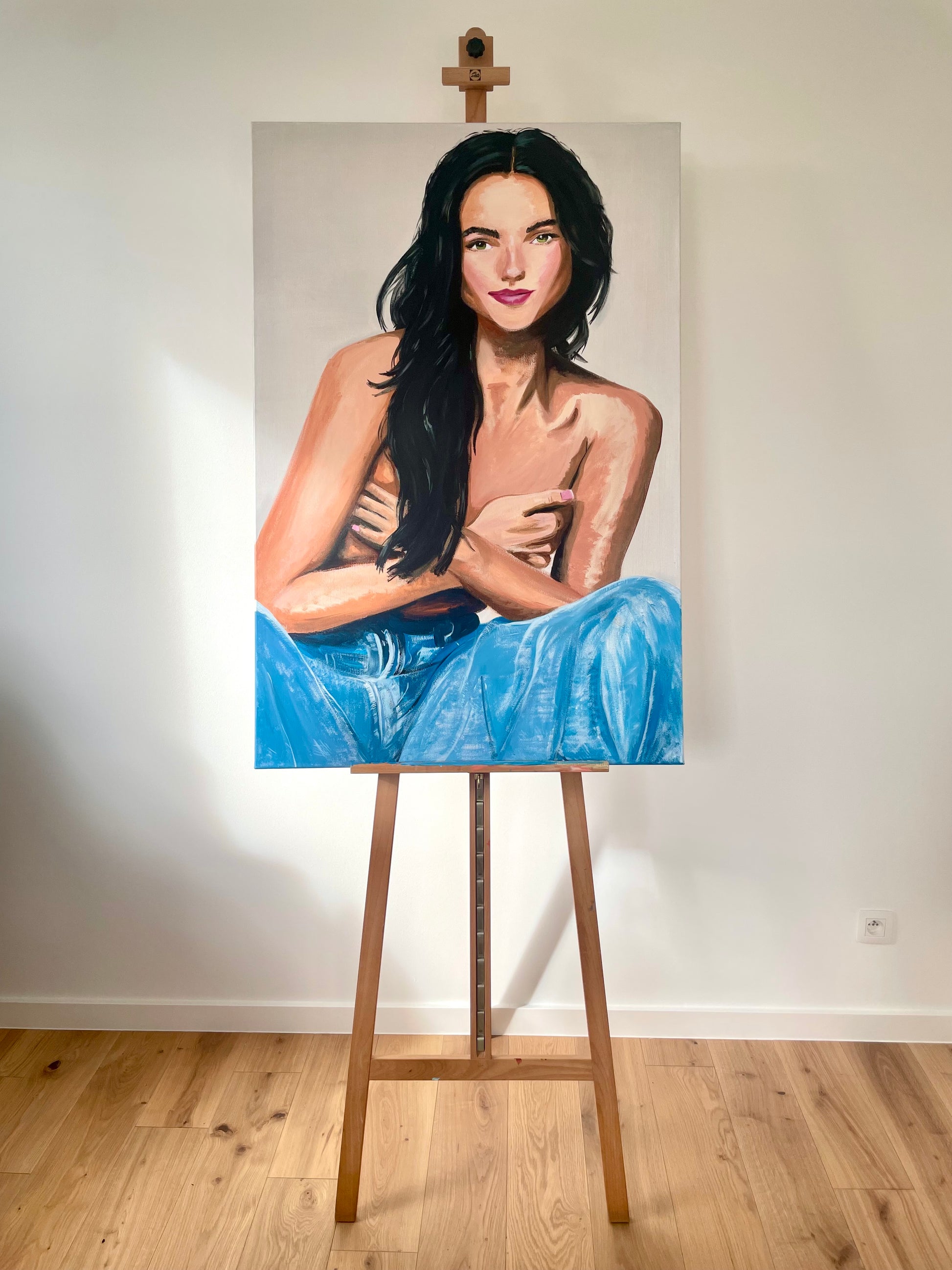 Dit schilderij toont een dame met prachtig zwart haar, gehuld enkel in een jeansbroek. Met haar handen bedekt ze haar borsten, waardoor een delicate balans ontstaat tussen sensualiteit en zelfbewustzijn. Haar krachtige aanwezigheid en de subtiele combinatie van kleding en houding maken dit kunstwerk tot een fascinerende uitdrukking van vrouwelijkheid en kracht.