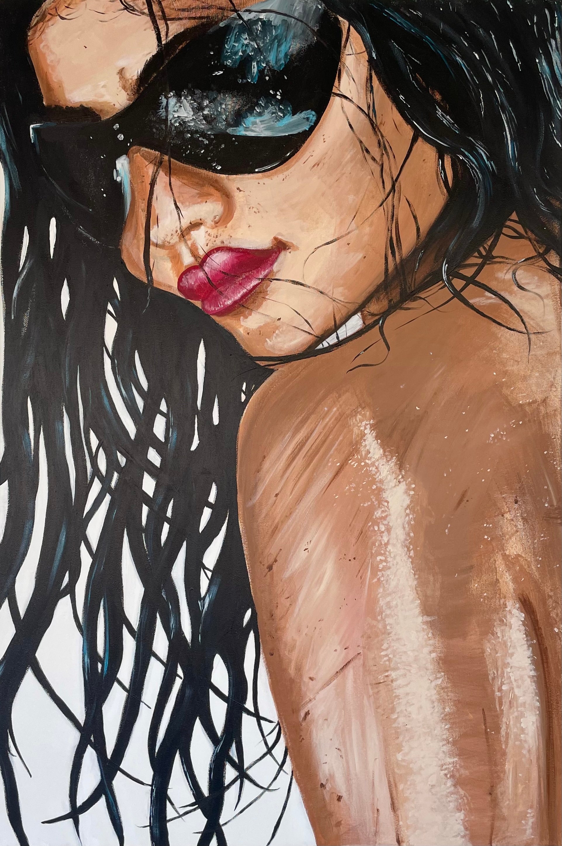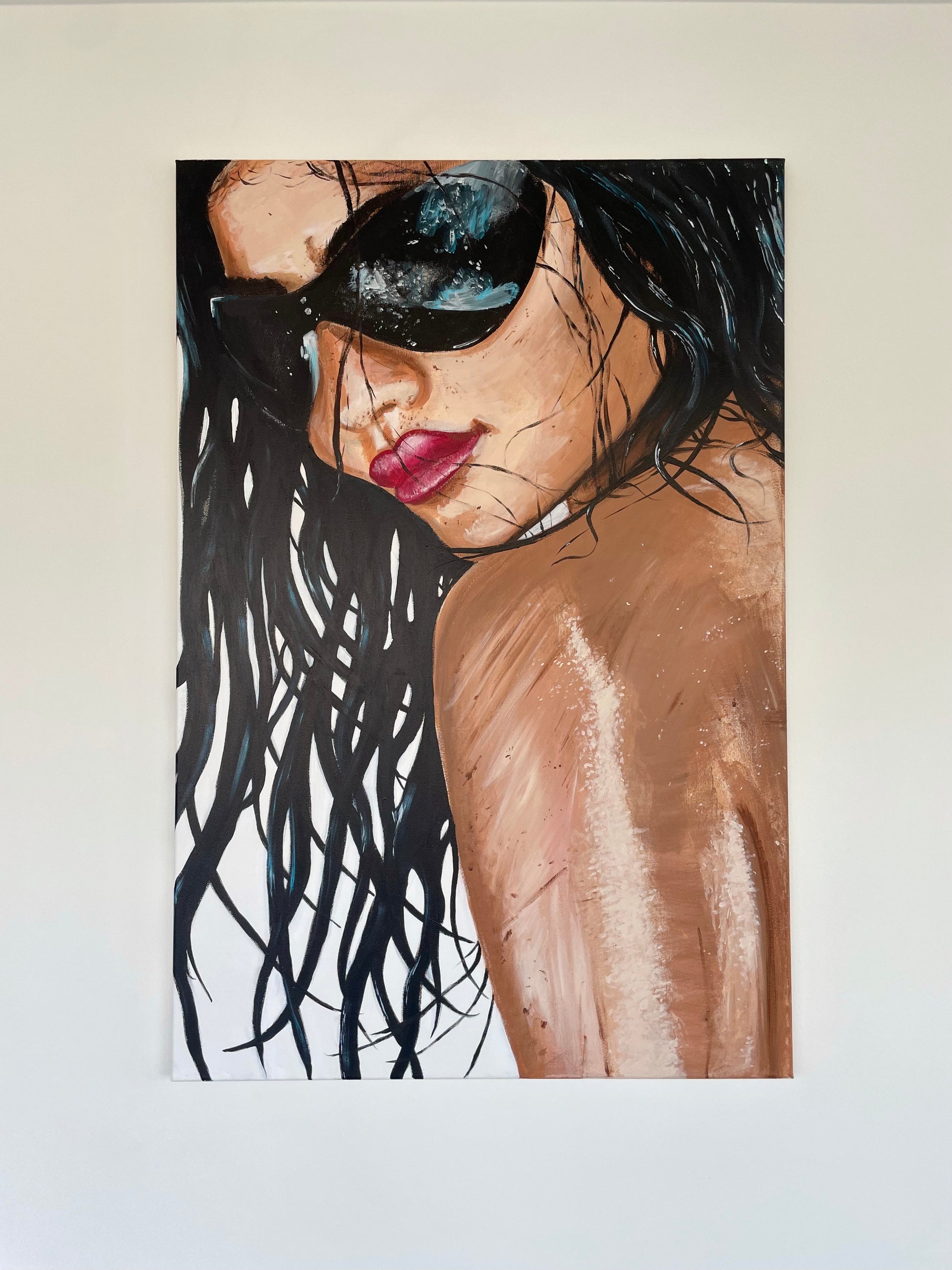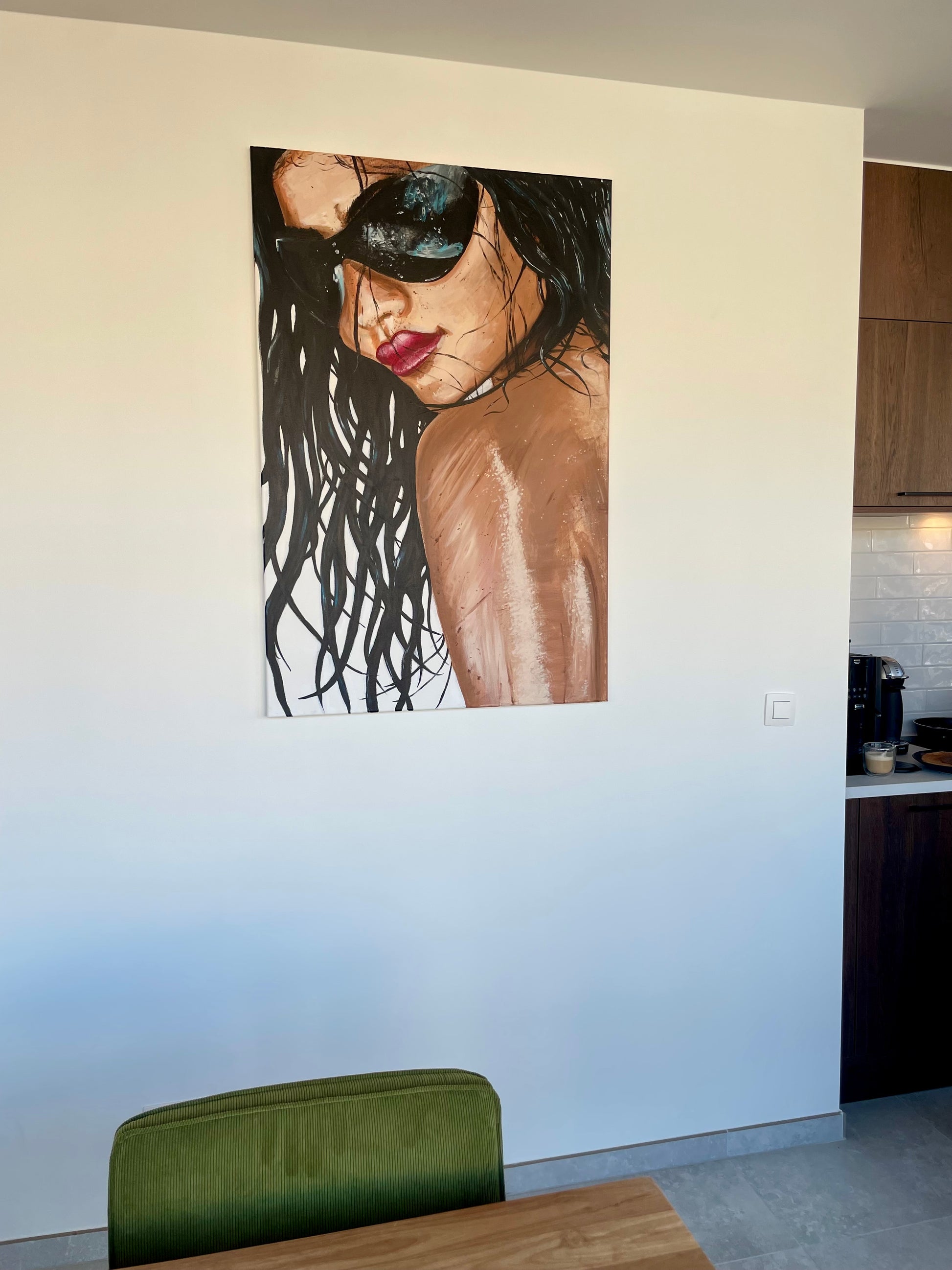 Dit schilderij toont een zwart-wit portret van een dame met een felle geelgroene achtergrond, wat zorgt voor een prachtig en opvallend contrast. Haar blik is ijskoel en lijkt van steen, terwijl ze je recht in de ogen aankijkt. De monochrome details van haar gezicht tegenover de levendige achtergrond creëren een intrigerende spanning en versterken de krachtige uitstraling van het kunstwerk.