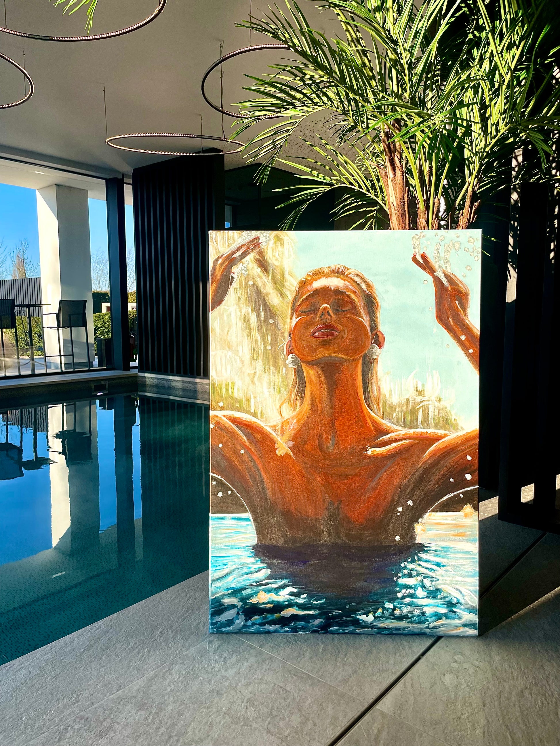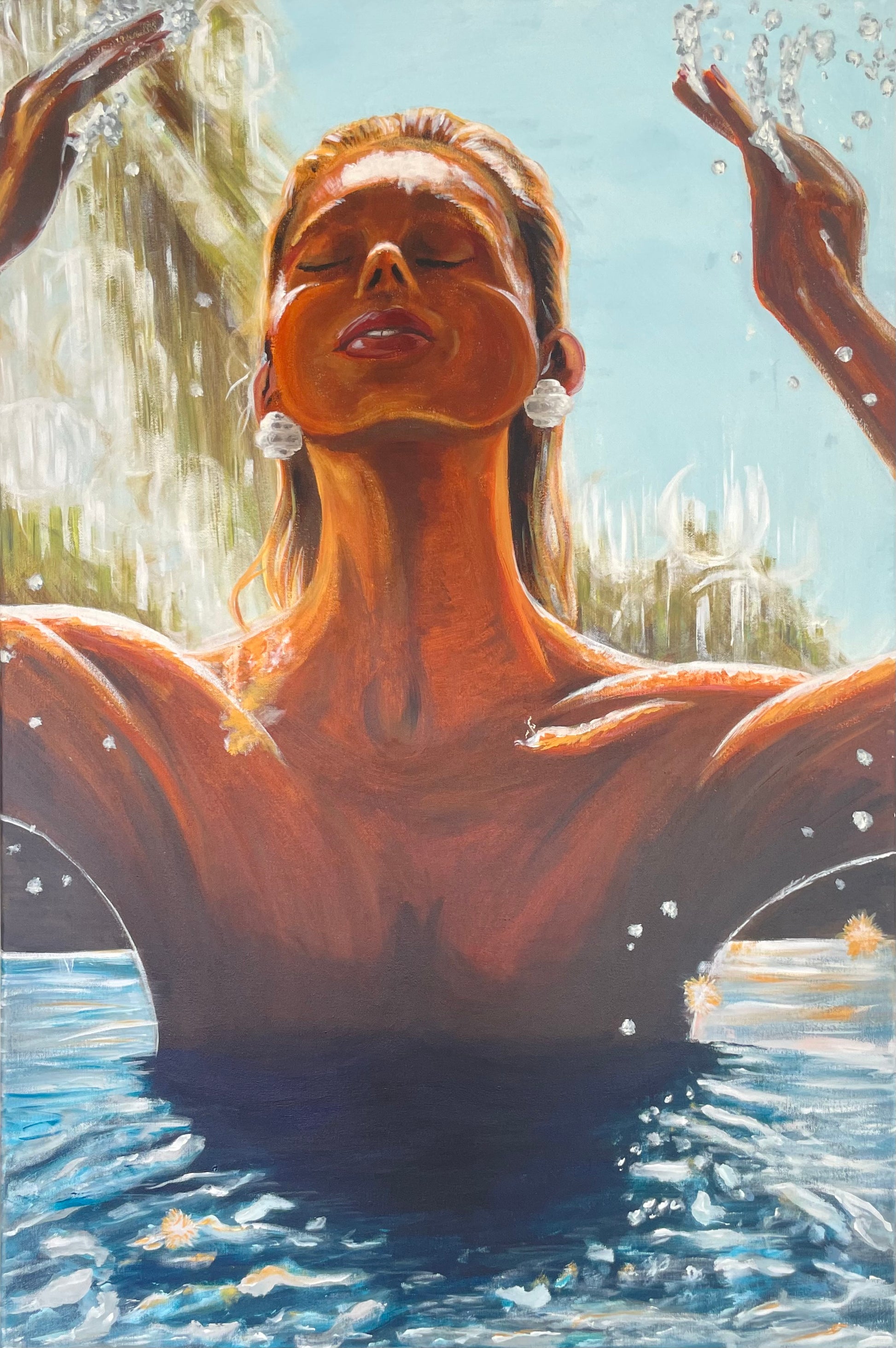 In dit schilderij komt de vrouw net uit het water, haar hoofd fier omhoog geheven en ogen gesloten, genietend van het moment. Waterdruppels vliegen in alle richtingen, terwijl ze haar handen omhoog brengt om haar haar te fatsoeneren. Haar borsten blijven net onder het wateroppervlak verborgen. De zon schijnt volop op haar, benadrukt haar zelfverzekerde houding en versterkt de zomerse sfeer. Dit beeld straalt kracht, elegantie en een vleugje mysterie uit.