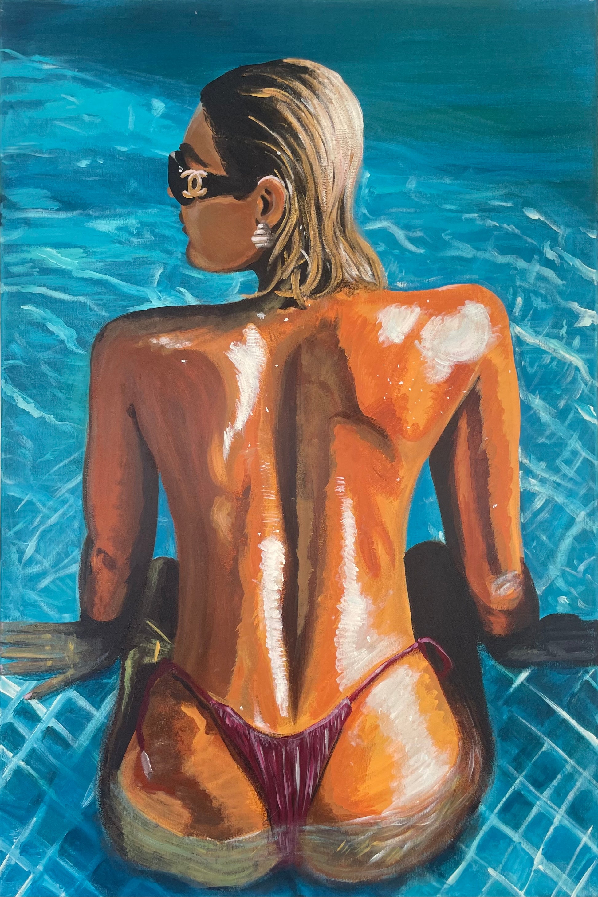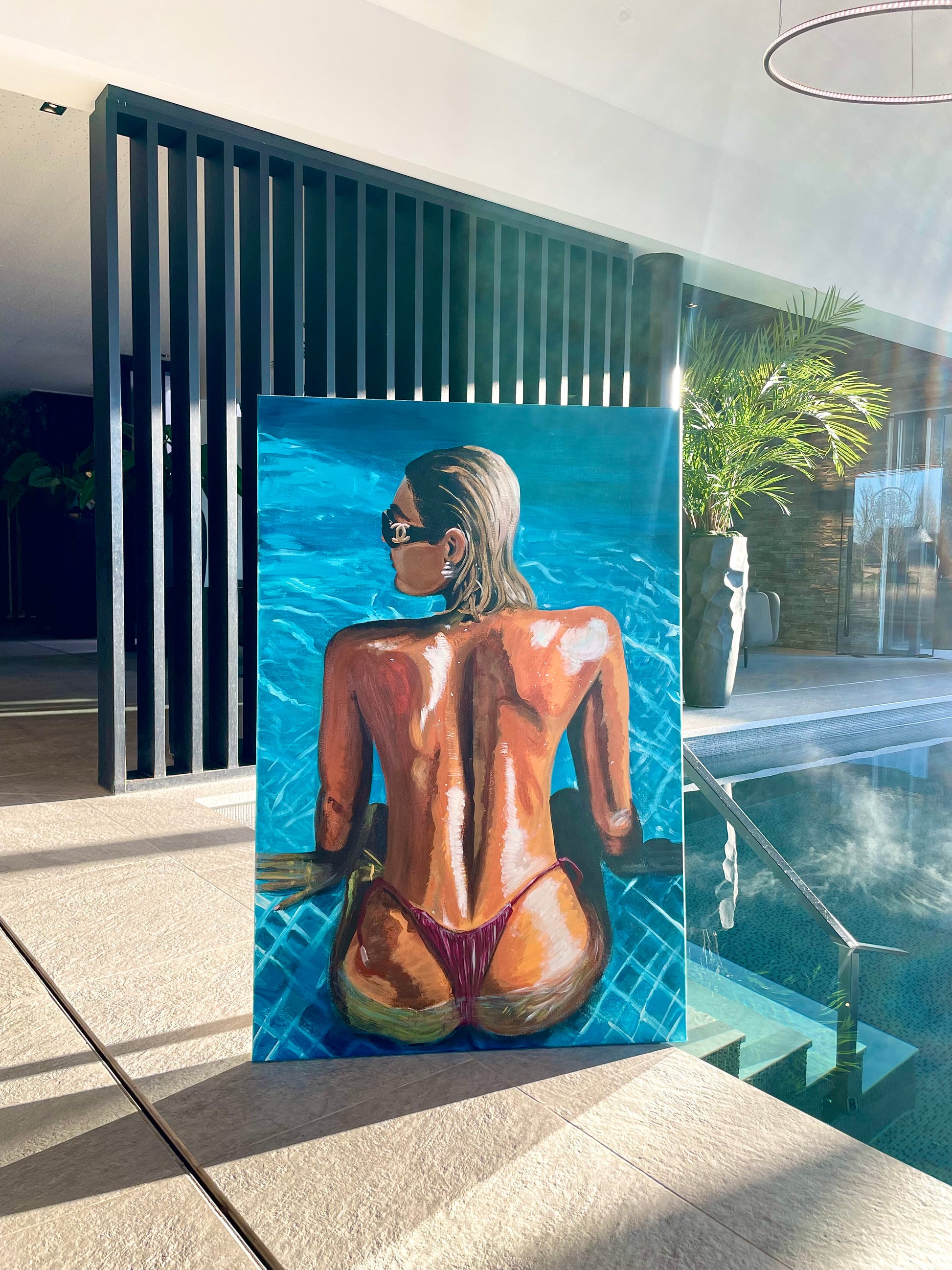 Dit schilderij toont een vrouw die ontspannen in het water zit, met haar rug naar de kijker toe. Ze kan de kijker niet zien, wat een gevoel van onschuld en privacy creëert. De achtergrond is volledig blauw, het heldere water vult het beeld met een serene sfeer. Haar achterste is volledig zichtbaar, wat een subtiel vleugje erotiek toevoegt aan het tafereel. Dit kunstwerk combineert eenvoud en sensualiteit, en nodigt uit tot stille bewondering.