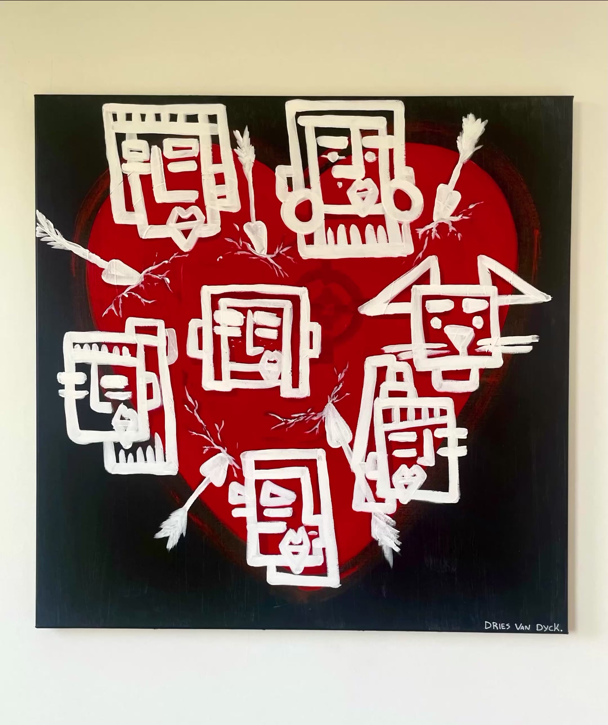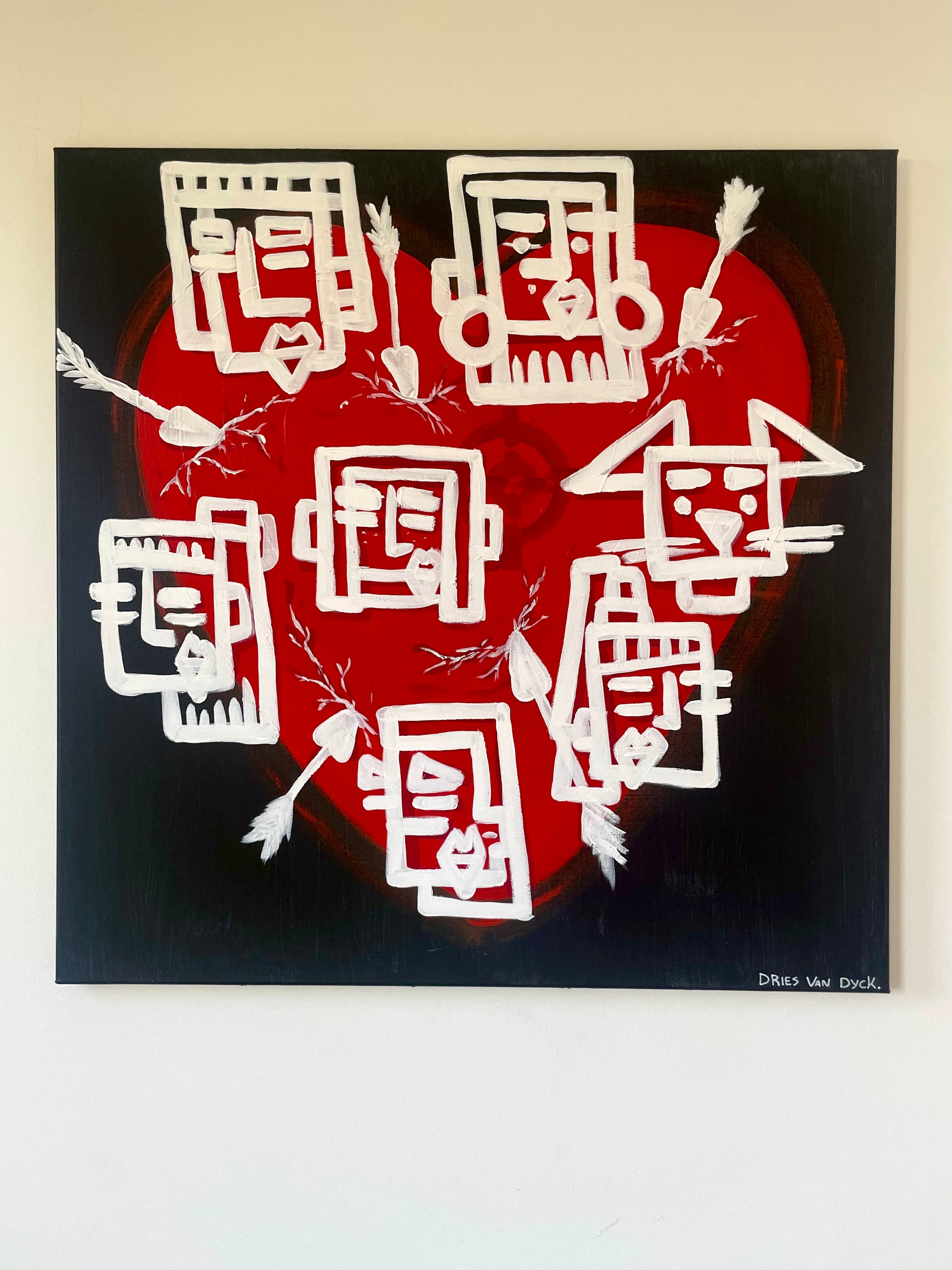 De gezichten binnen het hart geven het werk een dubbele betekenis. Ze kunnen de aantrekkingskracht zijn die de pijlen aantrekt, of ze vormen juist een schild om het hart te beschermen. Dit spanningsveld tussen aantrekking en bescherming voegt een gelaagde symboliek toe aan het werk, waarin liefde en kwetsbaarheid elkaar ontmoeten.