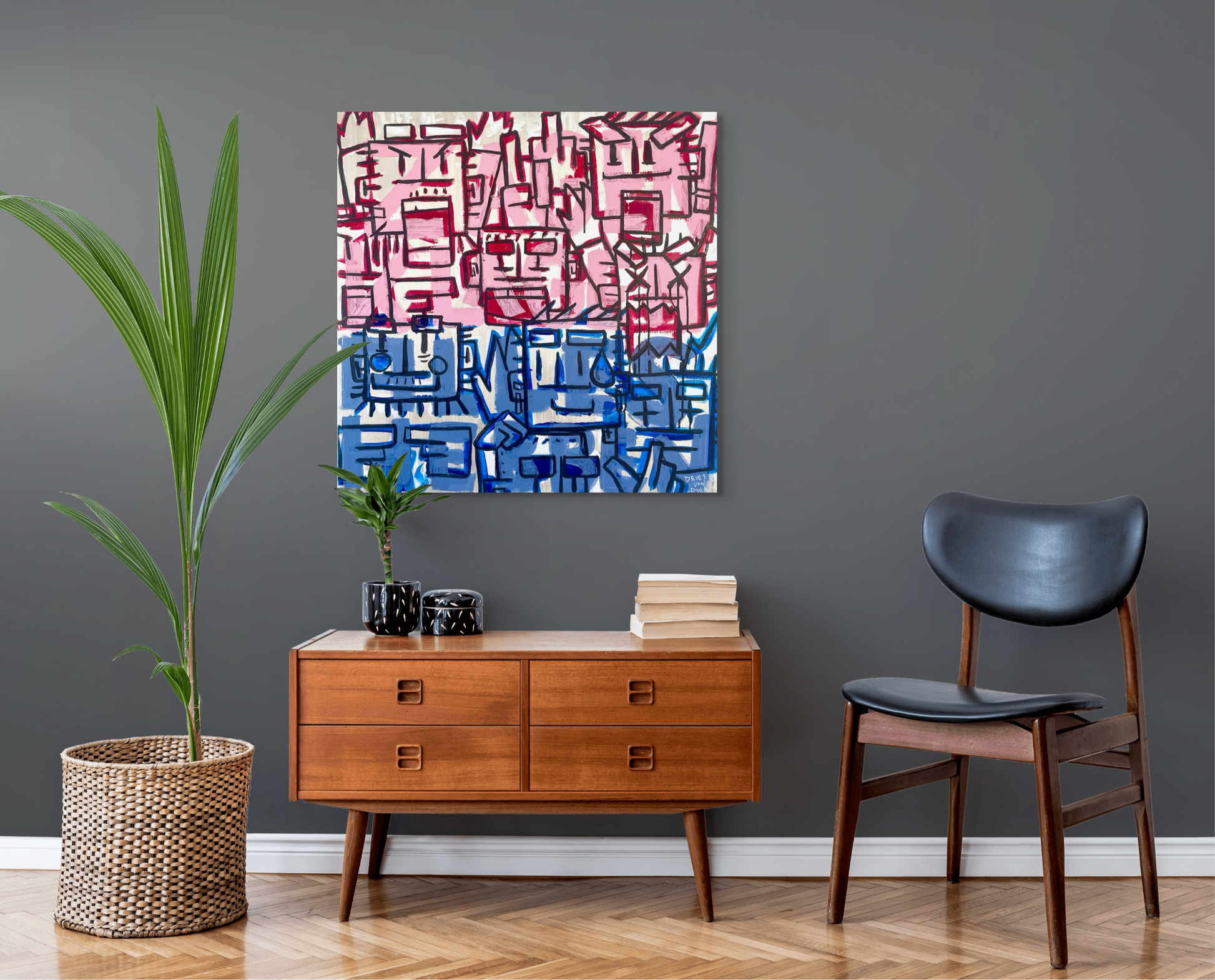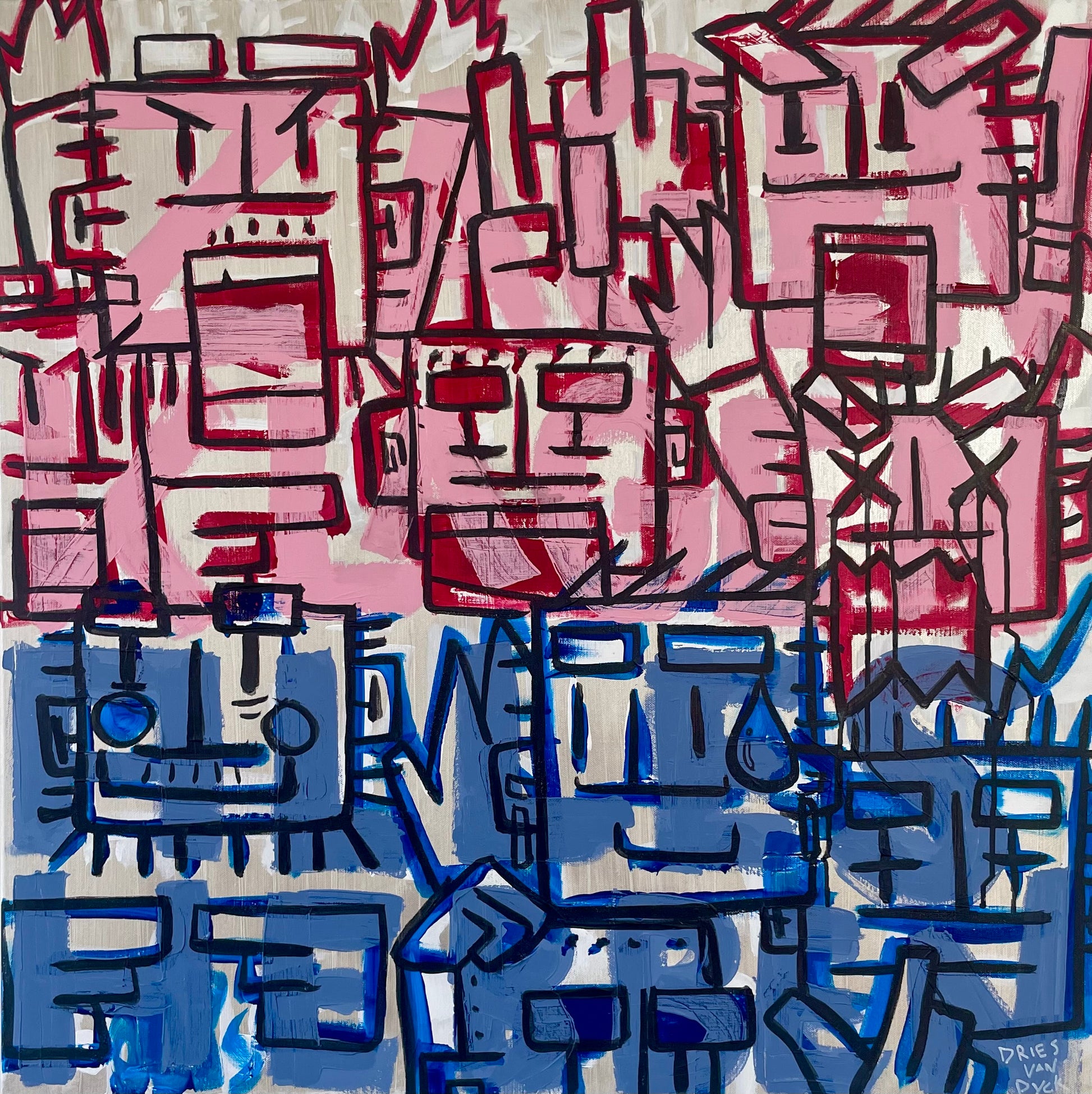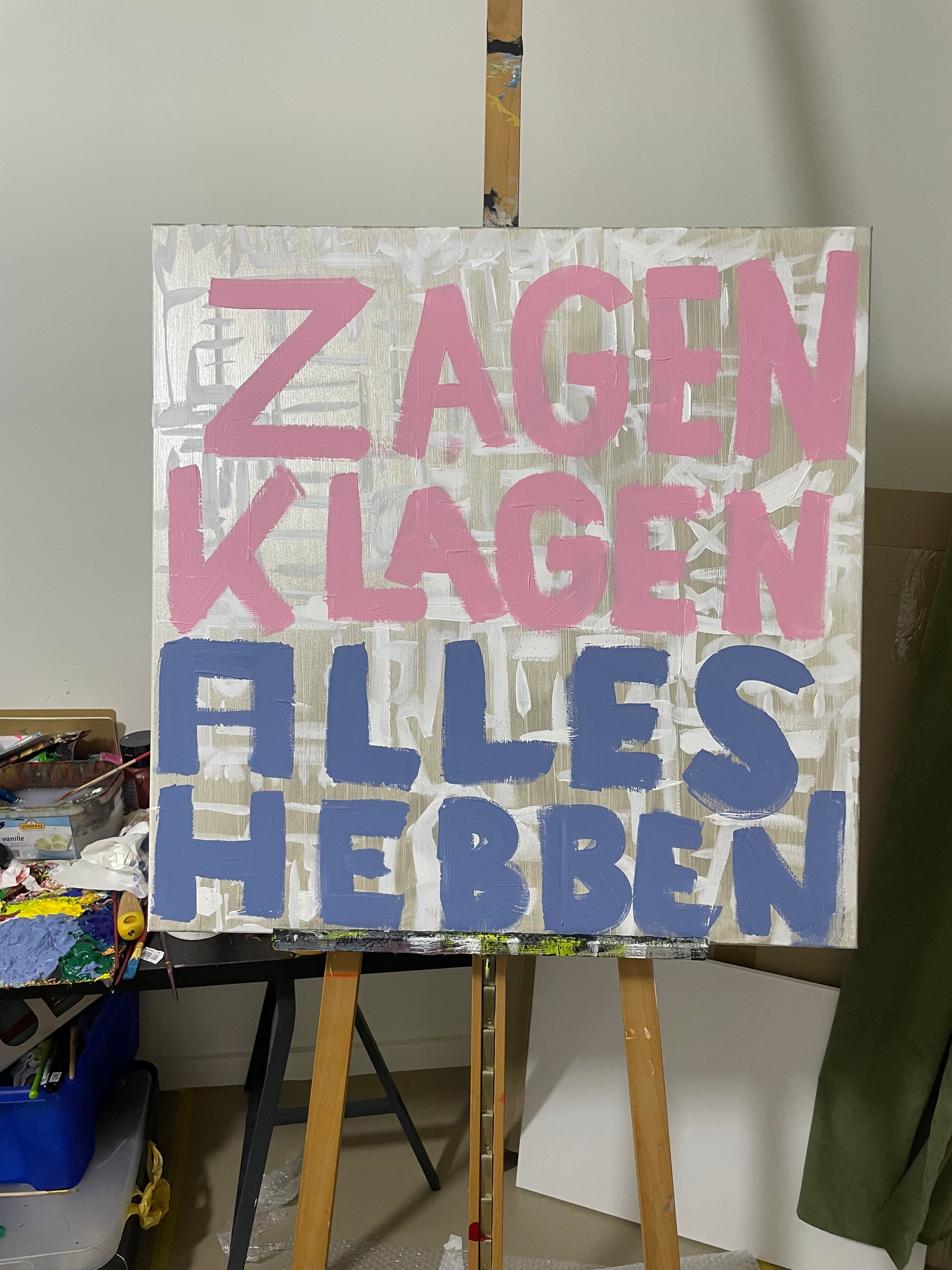 Beschrijving: Dit schilderij toont een krachtige boodschap over tevredenheid en zelfreflectie. Bovenaan zien we een groep figuren die schreeuwen en klagen, met op de achtergrond de woorden “zagen en klagen”—een herkenbare uitdrukking voor velen. Maar wanneer je naar de onderkant kijkt, worden diezelfde figuren stil, ze beseffen hun overdaad aan ontevredenheid en schamen zich. Op de achtergrond staat dan ook geschreven: “alles hebben.”