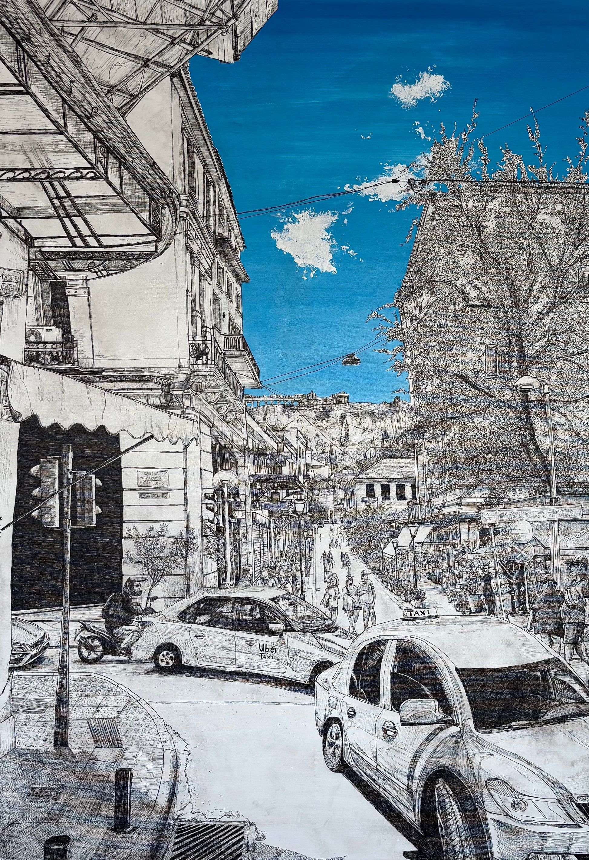 In het hart van Athene, tussen chaos en karakter, vond ik opnieuw de liefde voor mijn ‘Sketchy’-stijl: fijne lijnen, acrylvlakken, realiteit met een hoek af.
