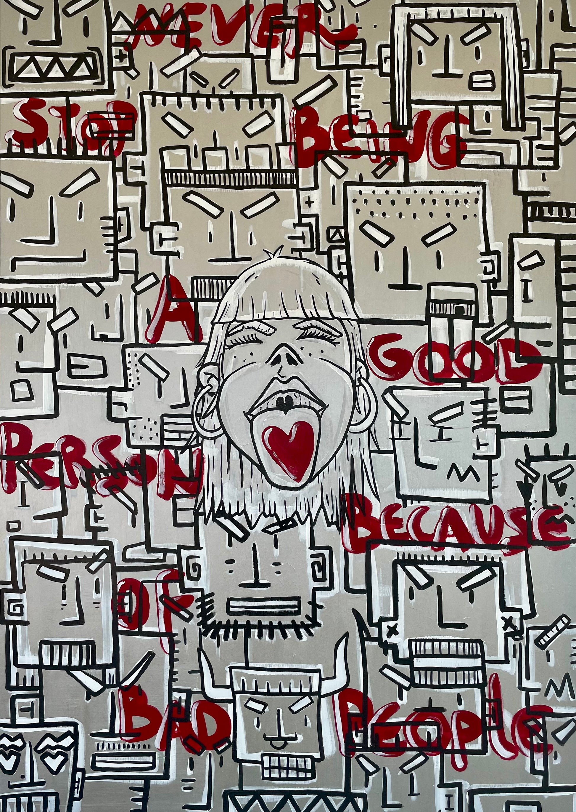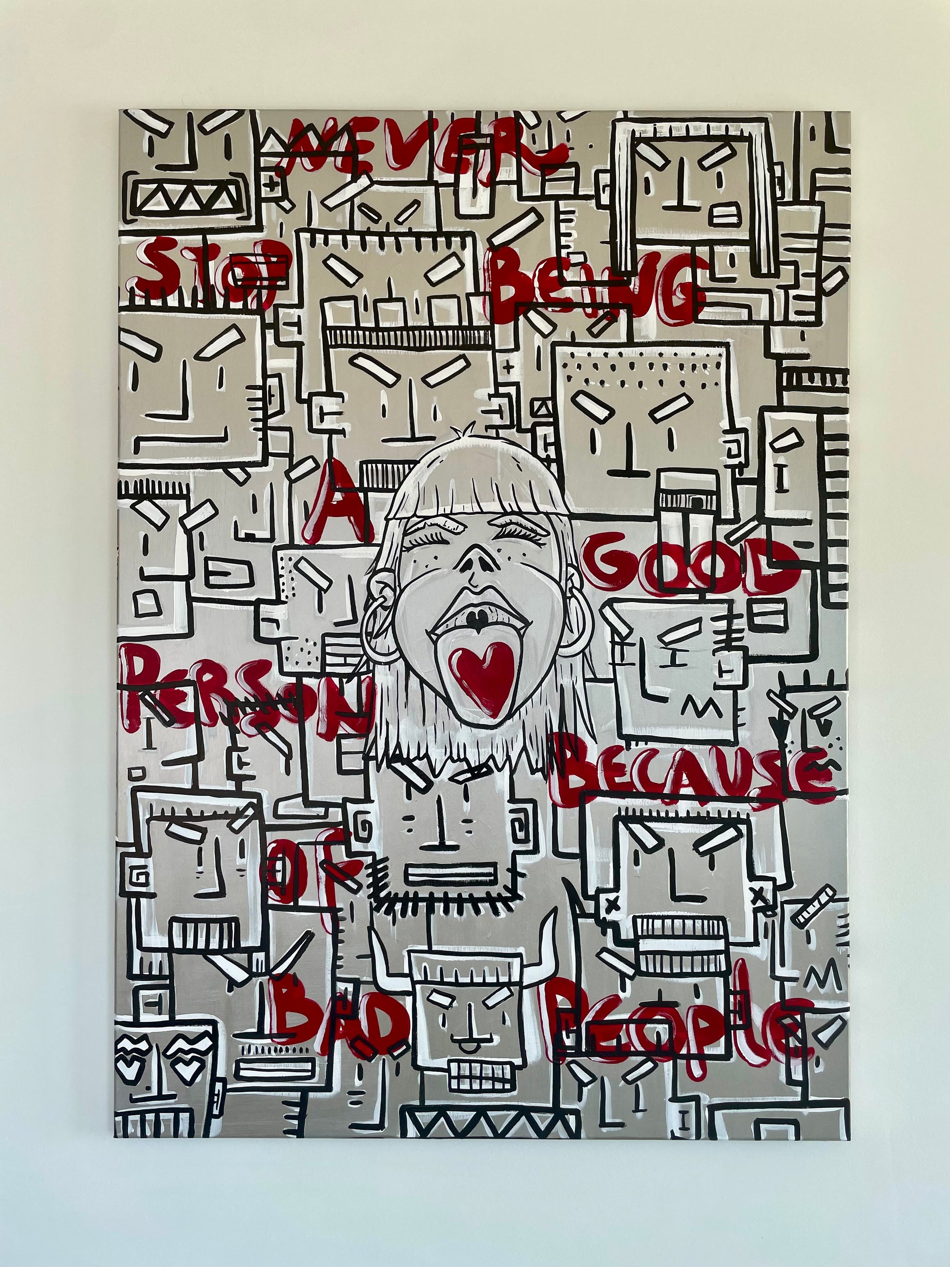 De tekst “Never stop being a good person because of bad people” benadrukt het centrale thema: blijf altijd vriendelijk, ook als de wereld om je heen dat niet is. Het schilderij herinnert ons eraan dat innerlijke goedheid altijd sterker is dan negativiteit.