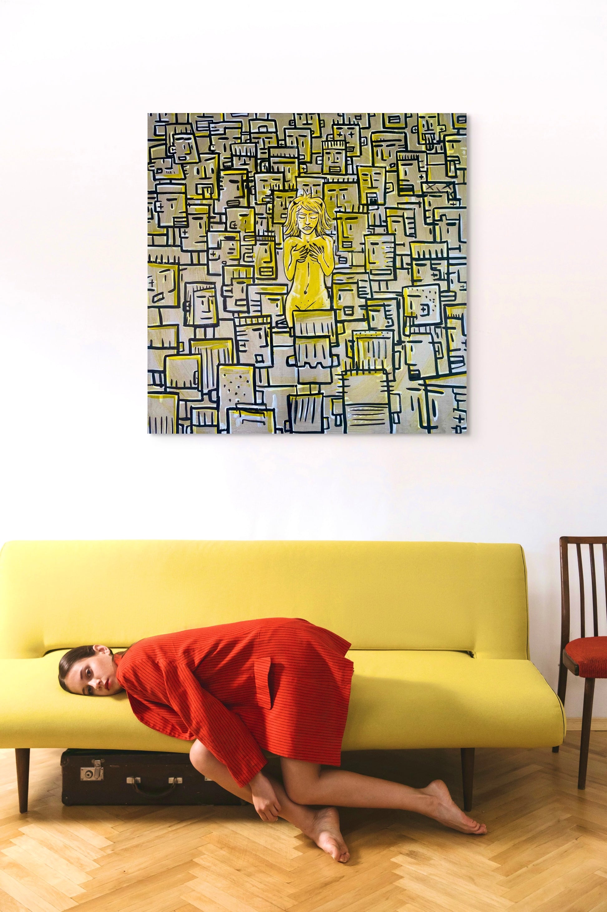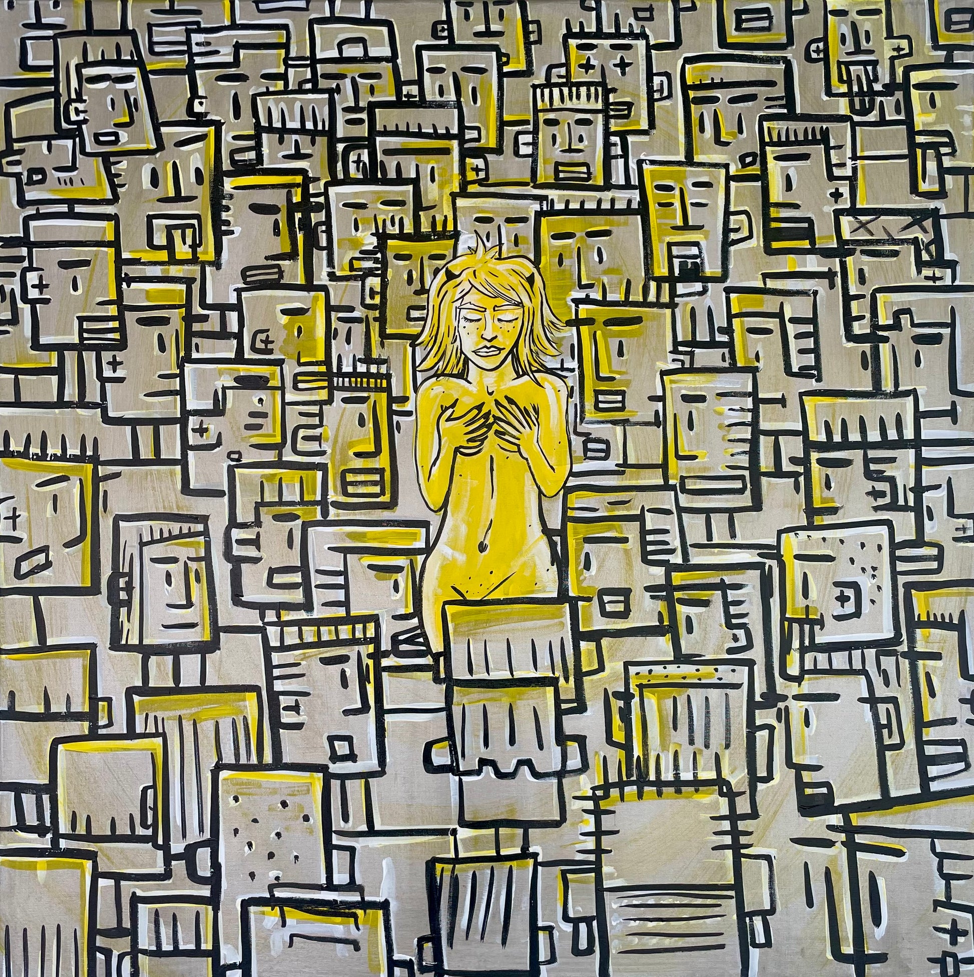 Een stralende gele vrouw staat centraal te midden van talloze mannenhoofden, elk met een unieke uitdrukking. De serene vrouw straalt een warme, gele gloed uit die de zilveren, glanzende mannenhoofden rondom haar verlicht. Dit contrast benadrukt zowel de schoonheid van de vrouw als de vaak ongemanierde mannelijkheid. Terwijl de vrouw rust en kracht uitstraalt, lijken de mannen in hun zilveren gedaante gevangen in hun eigen oppervlakkige bestaan, waar haar schoonheid een zeldzaam lichtpuntje vormt. Het is een werk waarin je kunt verdwalen, vol details en spanning tussen rust en obsessie.