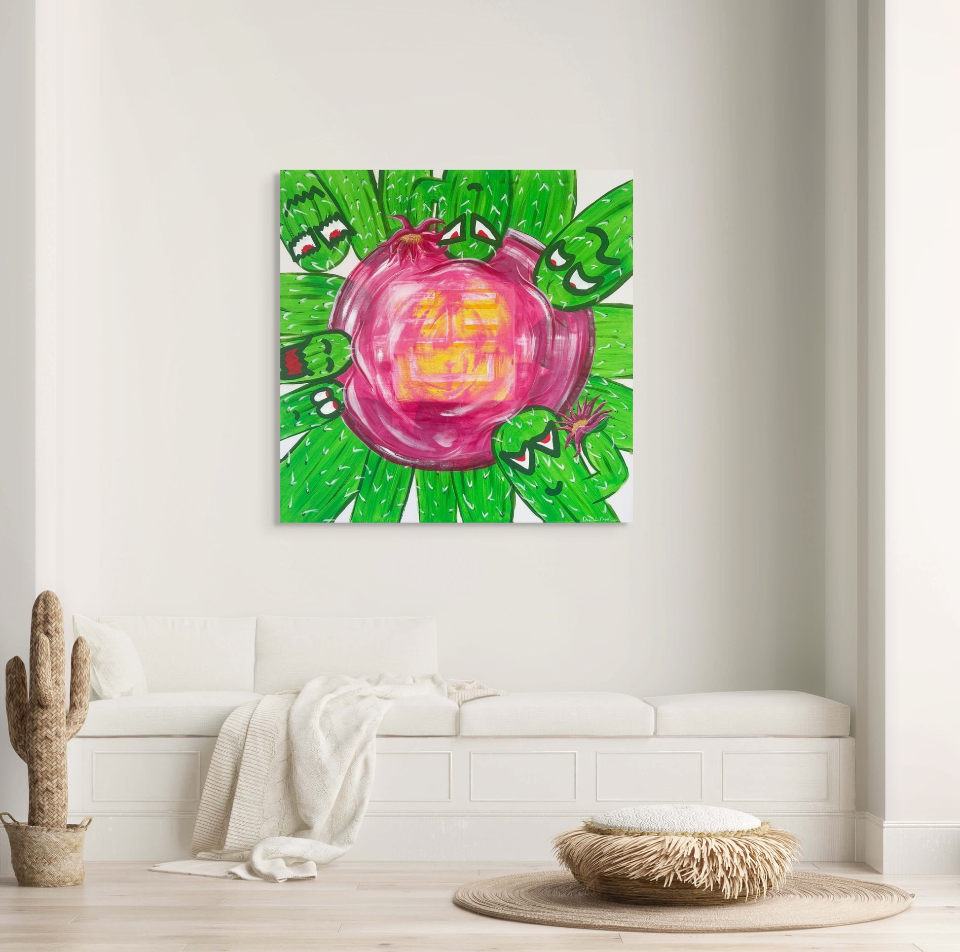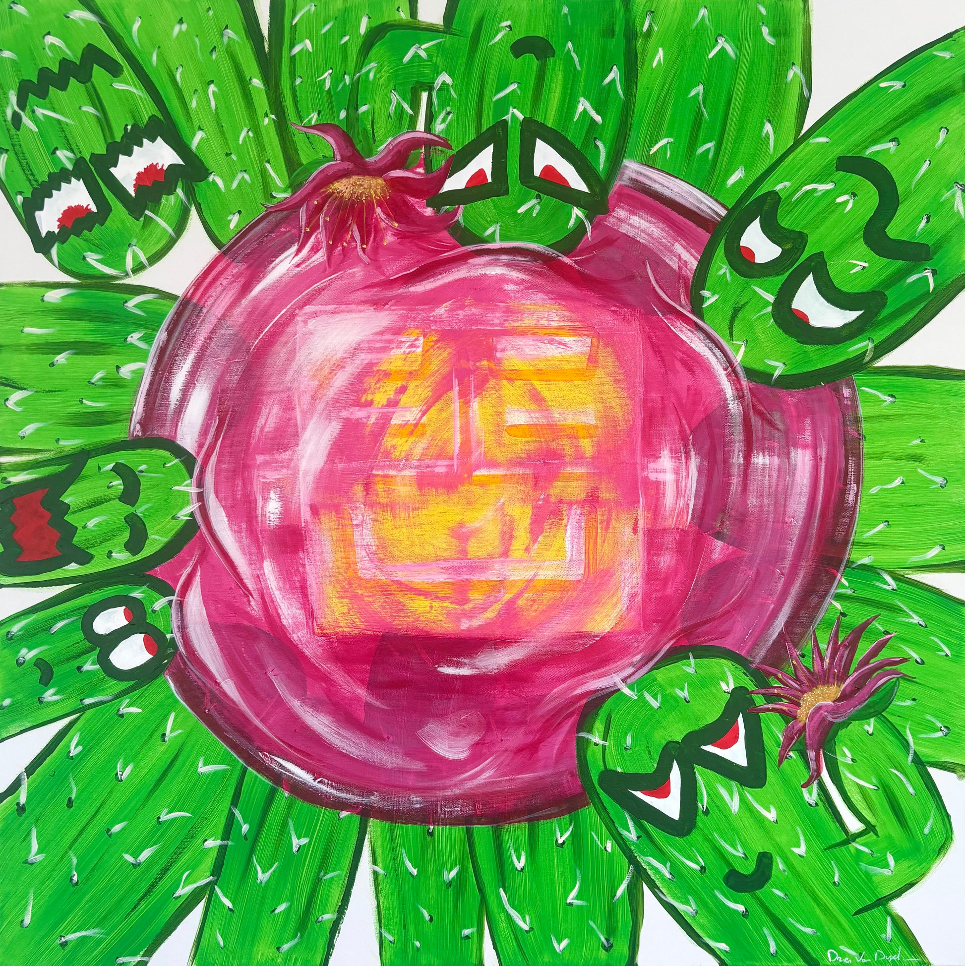 In een wereld vol scherpe prikkels en constante druk bewaart hij zijn rust. Geel en stralend, beschermd in een bubbel van eigenheid. De cactussen mogen proberen, maar zolang hij kalm blijft in zijn hoofd, kan er niets gebeuren. Een ode aan mentale grenzen en het belang van terugkeren naar stilte.