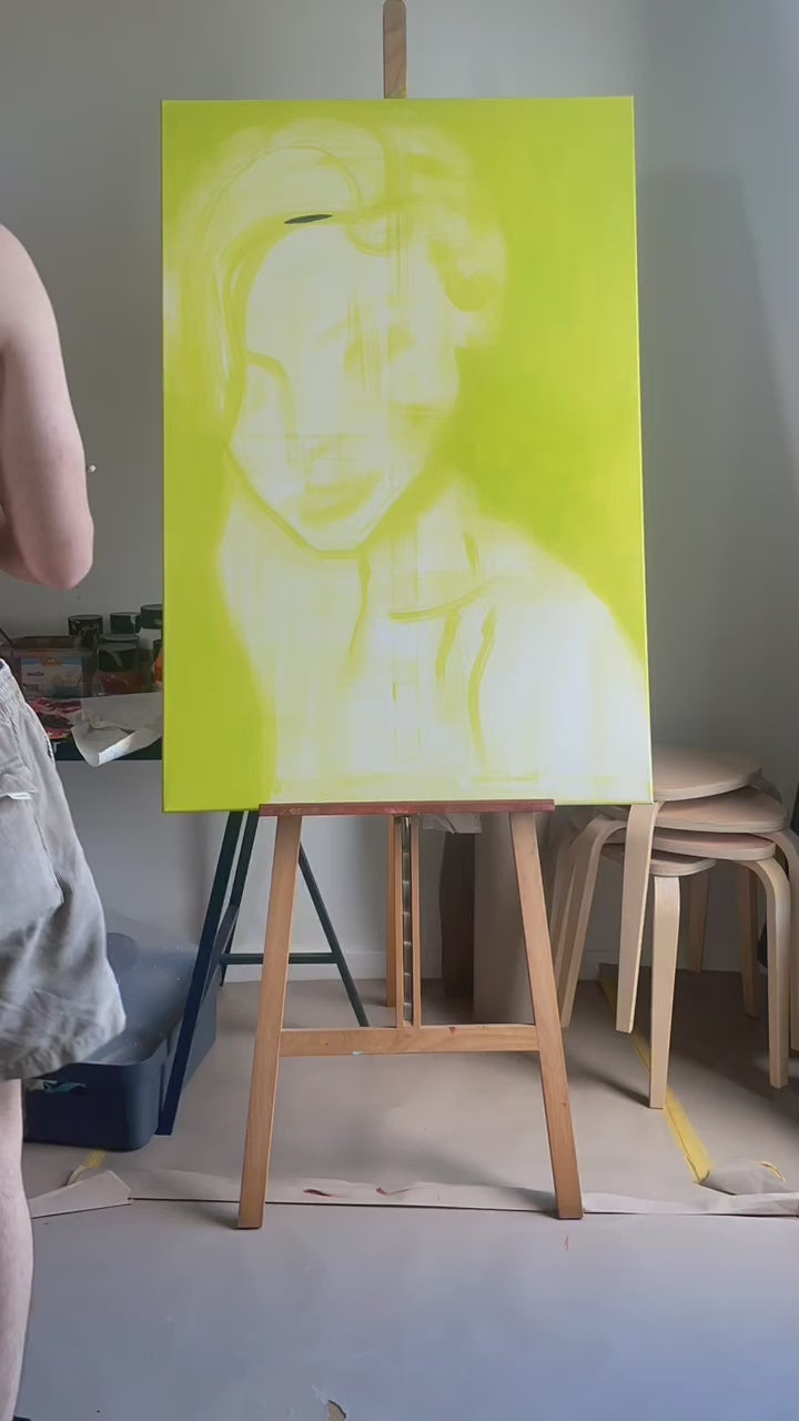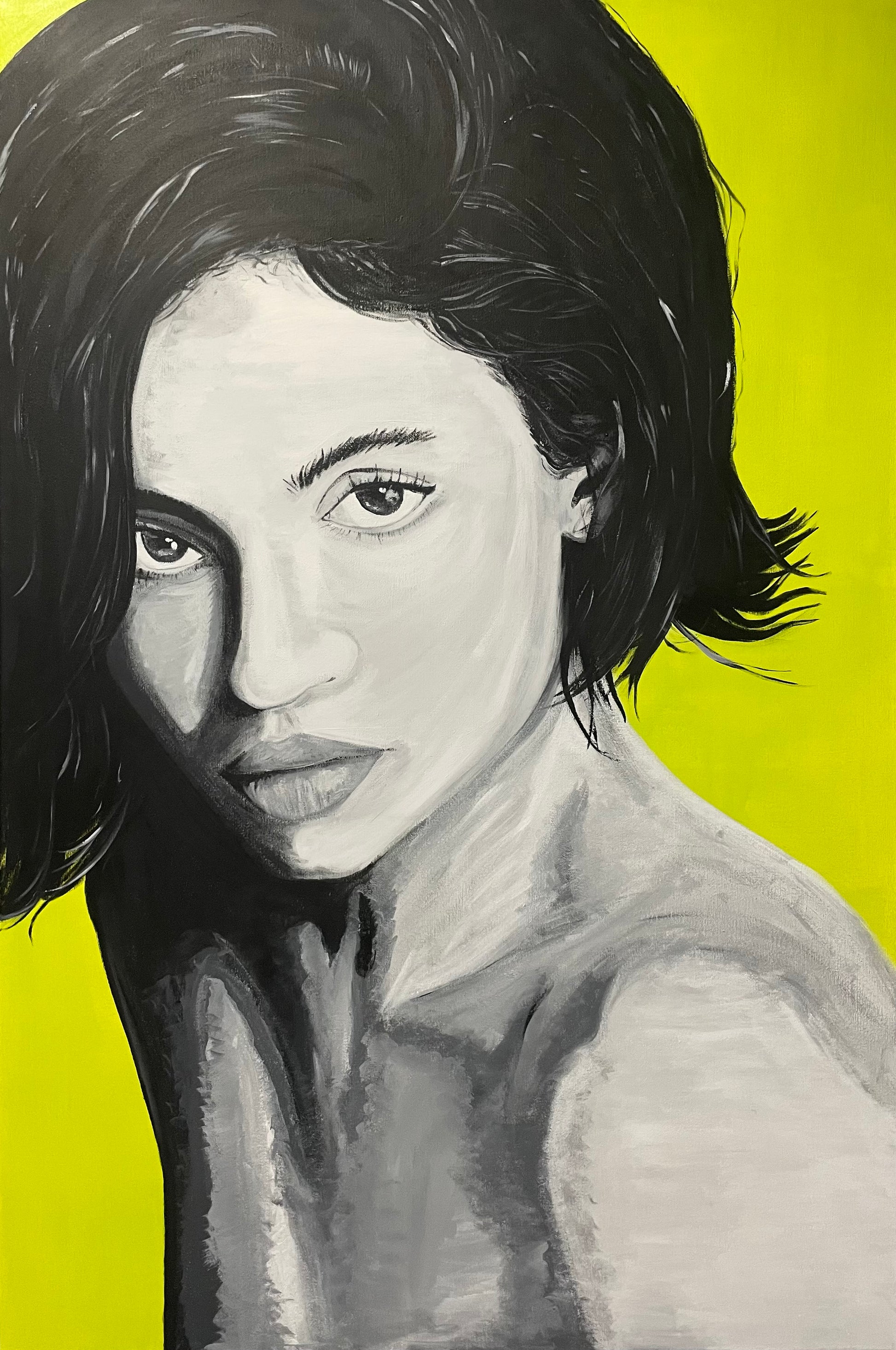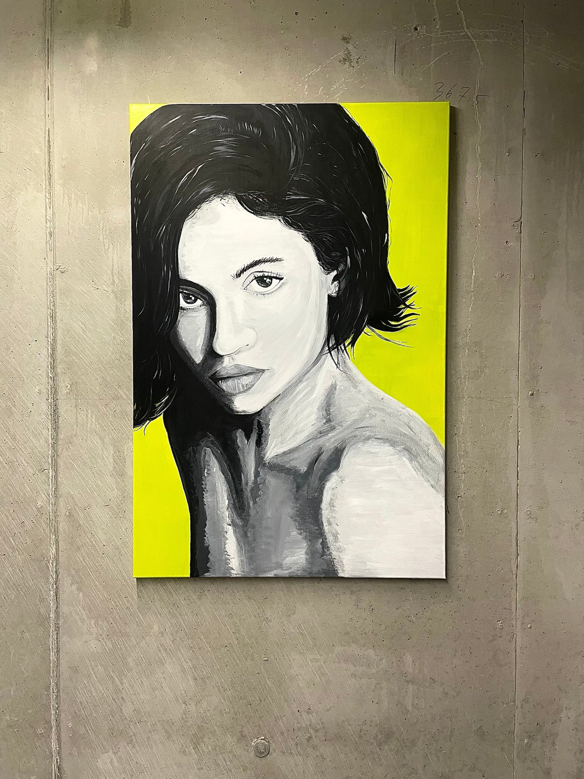 Dit schilderij toont een zwart-wit portret van een dame met een felle geelgroene achtergrond, wat zorgt voor een prachtig en opvallend contrast. Haar blik is ijskoel en ze lijkt van steen, terwijl ze je recht in de ogen aankijkt. De monochrome details van haar gezicht tegenover de levendige achtergrond creëren een intrigerende spanning en versterken de krachtige uitstraling van het kunstwerk.