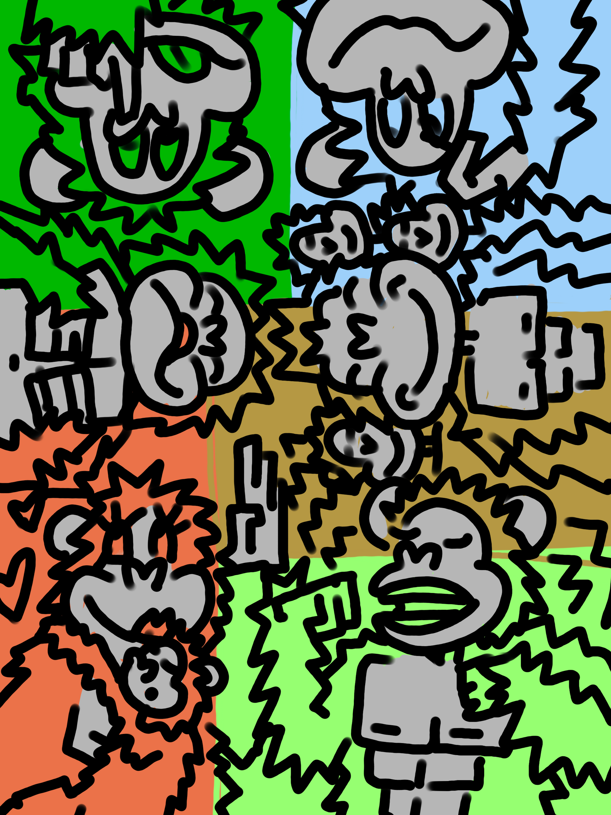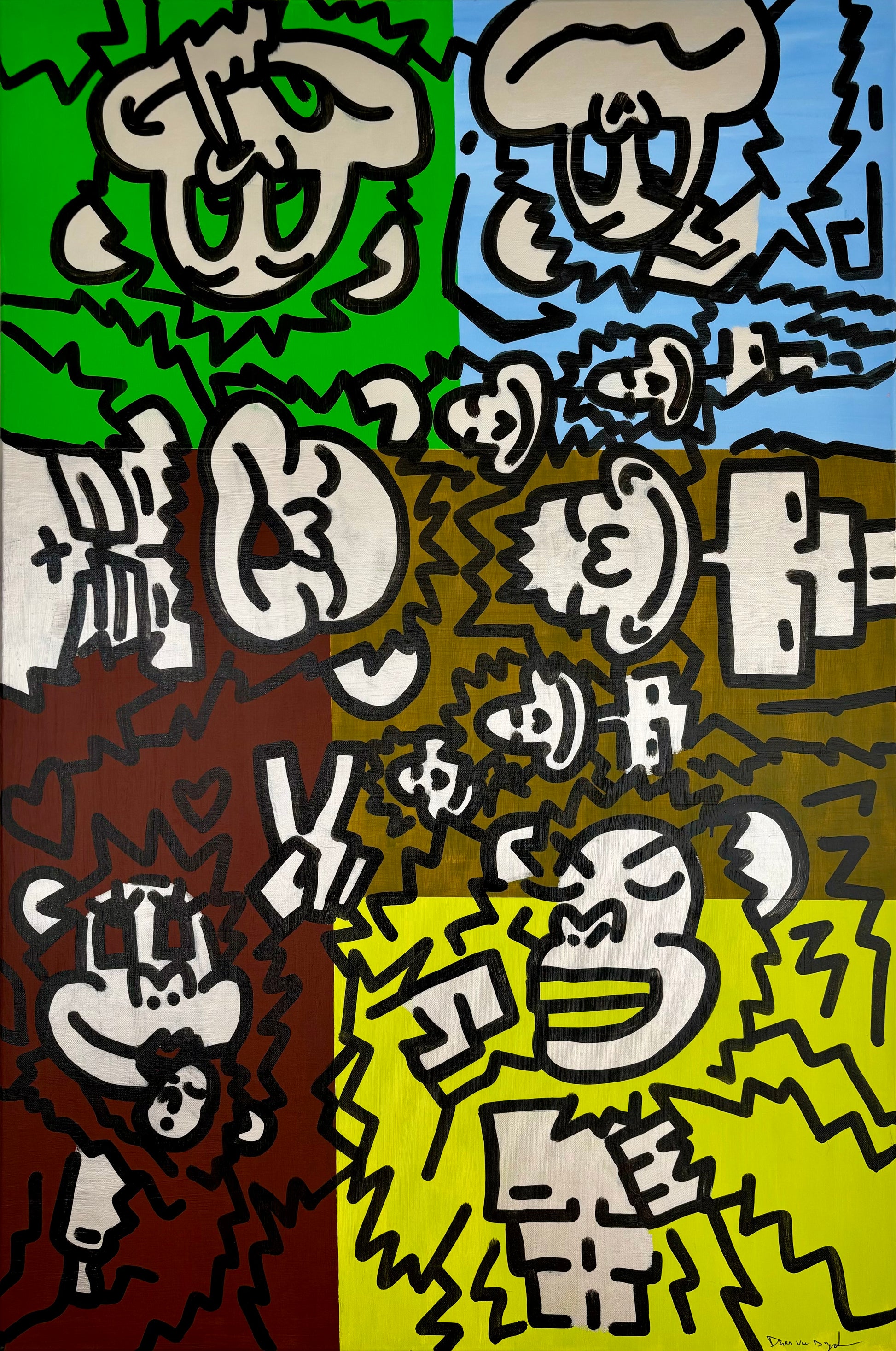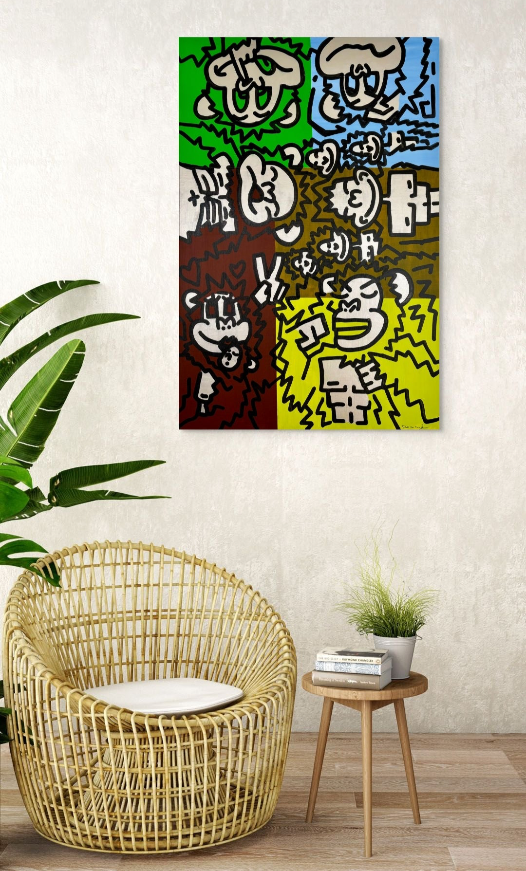 Dit schilderij ontstond uit de gedachte dat we ons als mensen vaak druk maken om keuzes, prestaties en verwachtingen. Maar in werkelijkheid volgen we vaak nog steeds de instincten die we met apen delen. Wanneer ik me zorgen maak, herinner ik mezelf eraan dat we ergens nog steeds apen zijn, gewoon zonder staart, verbonden met de natuur. Dit besef brengt rust, want het herinnert me eraan dat we niet altijd alles onder controle hoeven te hebben – we zijn een deel van een groter geheel.