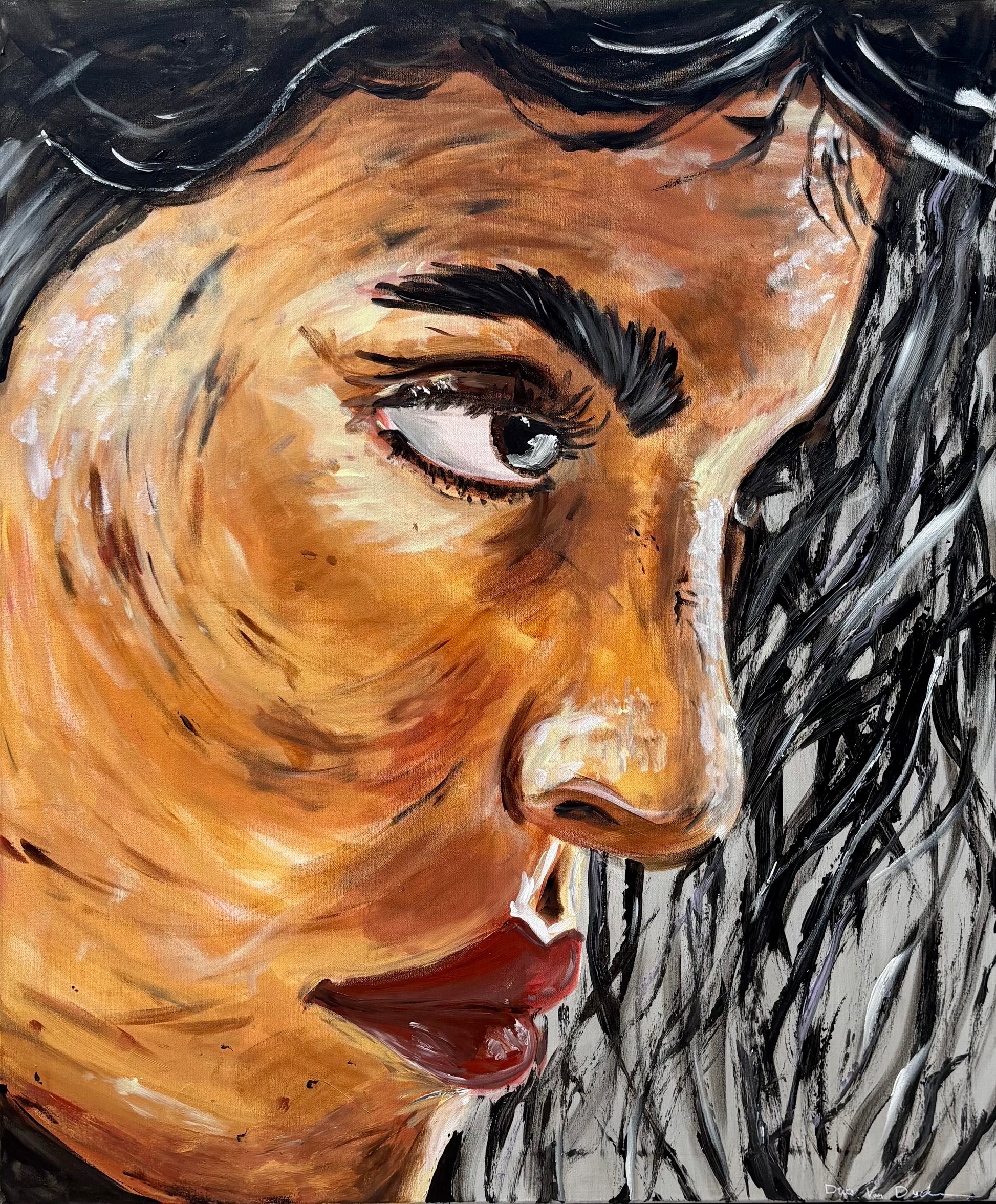 Het werk ontstond intuïtief: ik begon met grove penseelstreken en bouwde verder met een make-up pad, wat zorgde voor textuur en karakter.