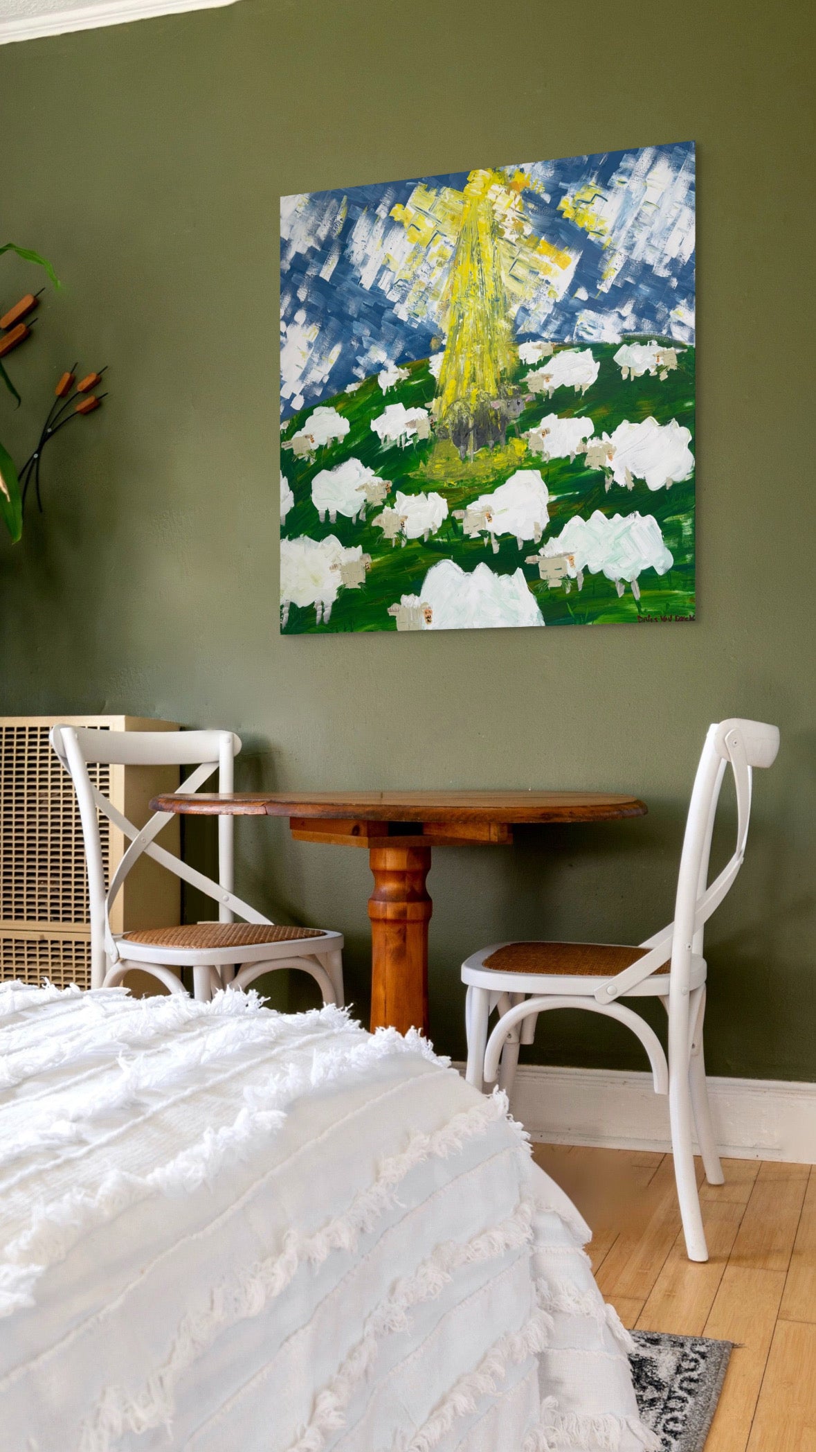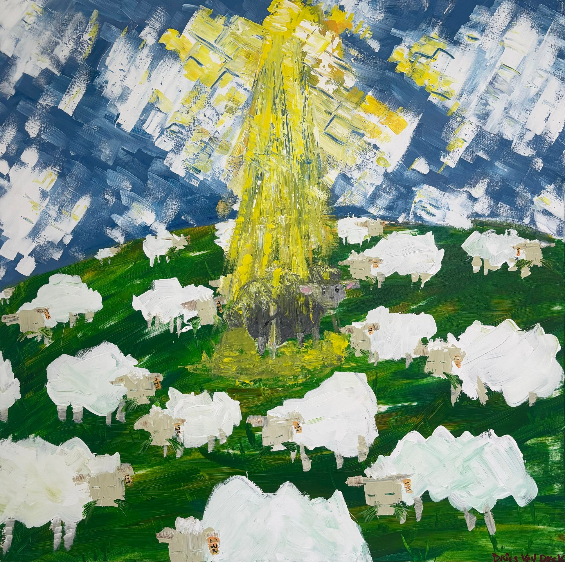 Geïnspireerd door het iconische Lam Gods en de krachtige, hoekige stijl van Erich Heckel, is dit schilderij een ode aan individualiteit en moed. Te midden van een weids landschap staat een zwart schaap, dat je recht aankijkt – een indringende blik vol zelfbewustzijn en vreugde. De andere schapen, allemaal wit, grazen rustig door, genummerd en ingelijfd in een systeem. Maar het zwarte schaap heeft geen nummer, geen ketens, en staat in het licht van een enkele zonnestraal die door de wolken breekt.