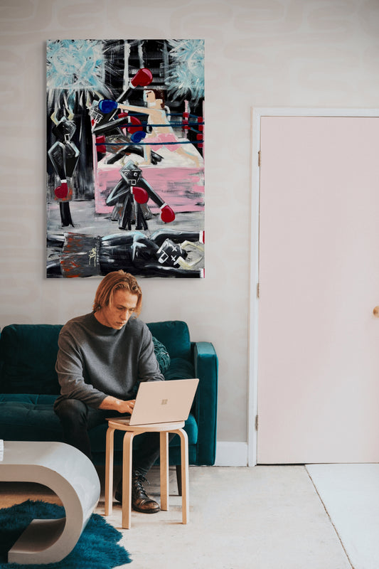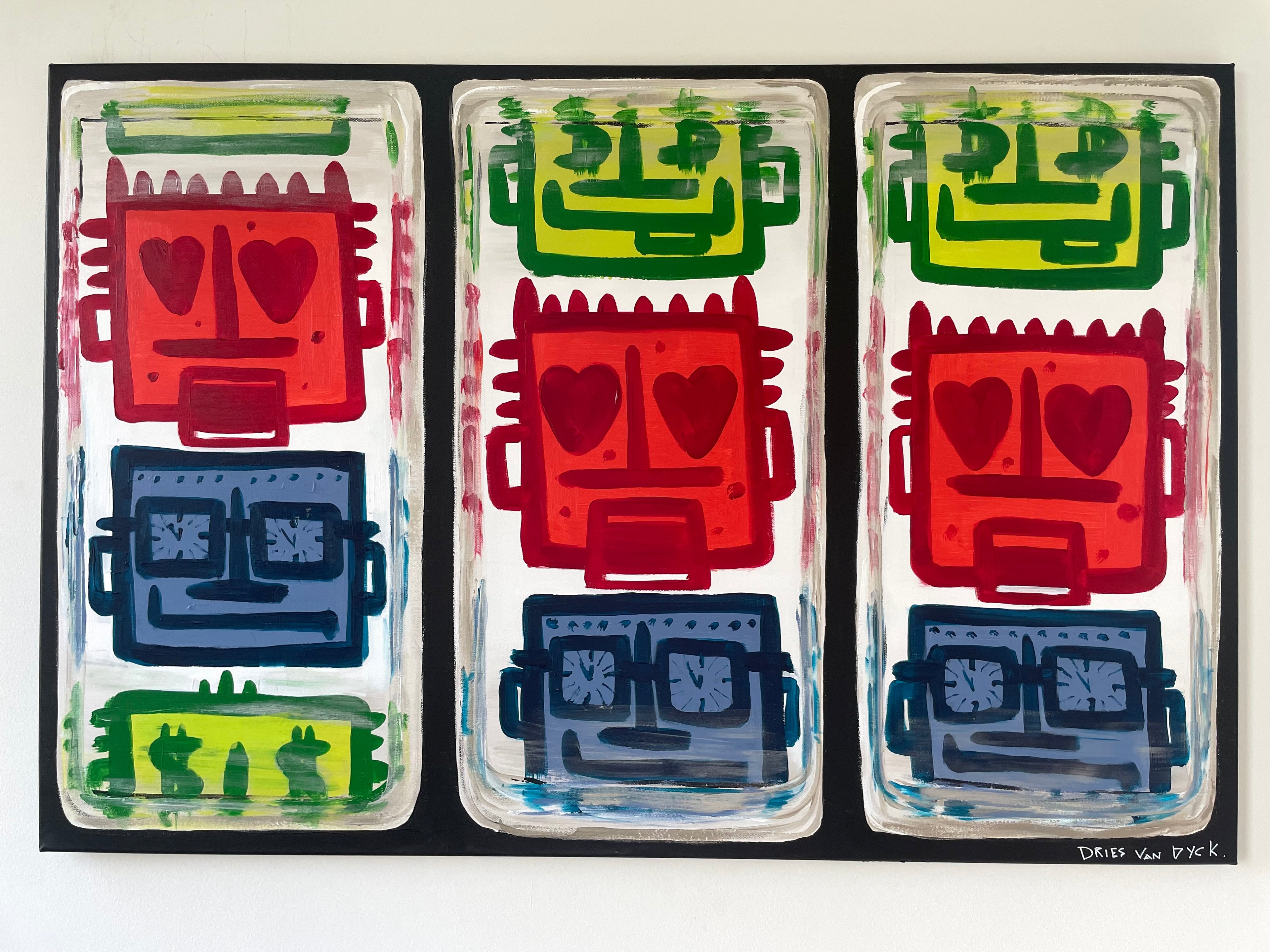Ik ben Dries, een Belgische schilder, gedreven door een eenvoudige waarheid: het leven is rommelig, kleurrijk en vol verborgen betekenissen.